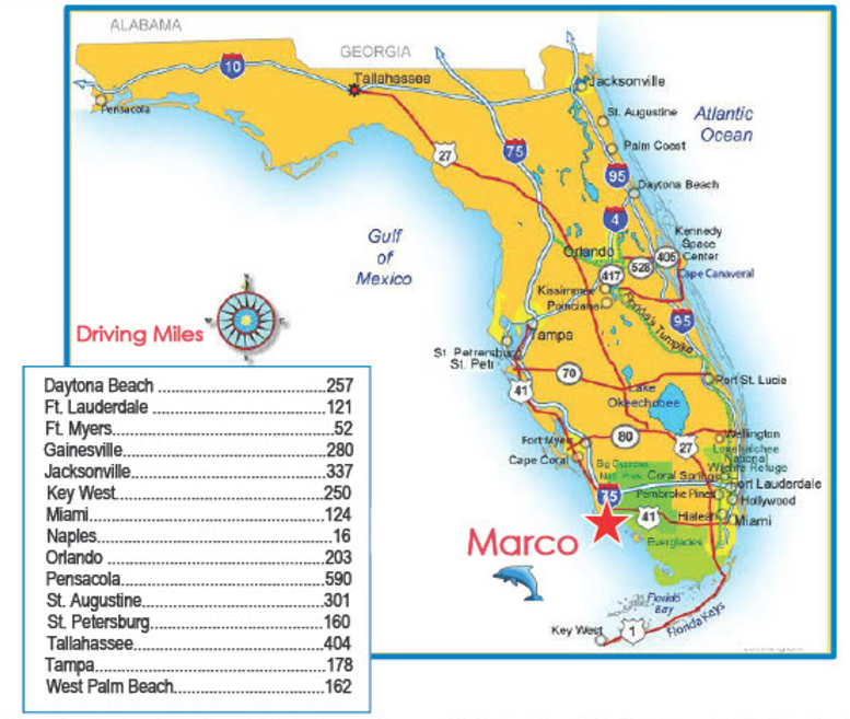 From Orlando, take I-4 West to I-75 South, then Exit 101 to Marco Island.